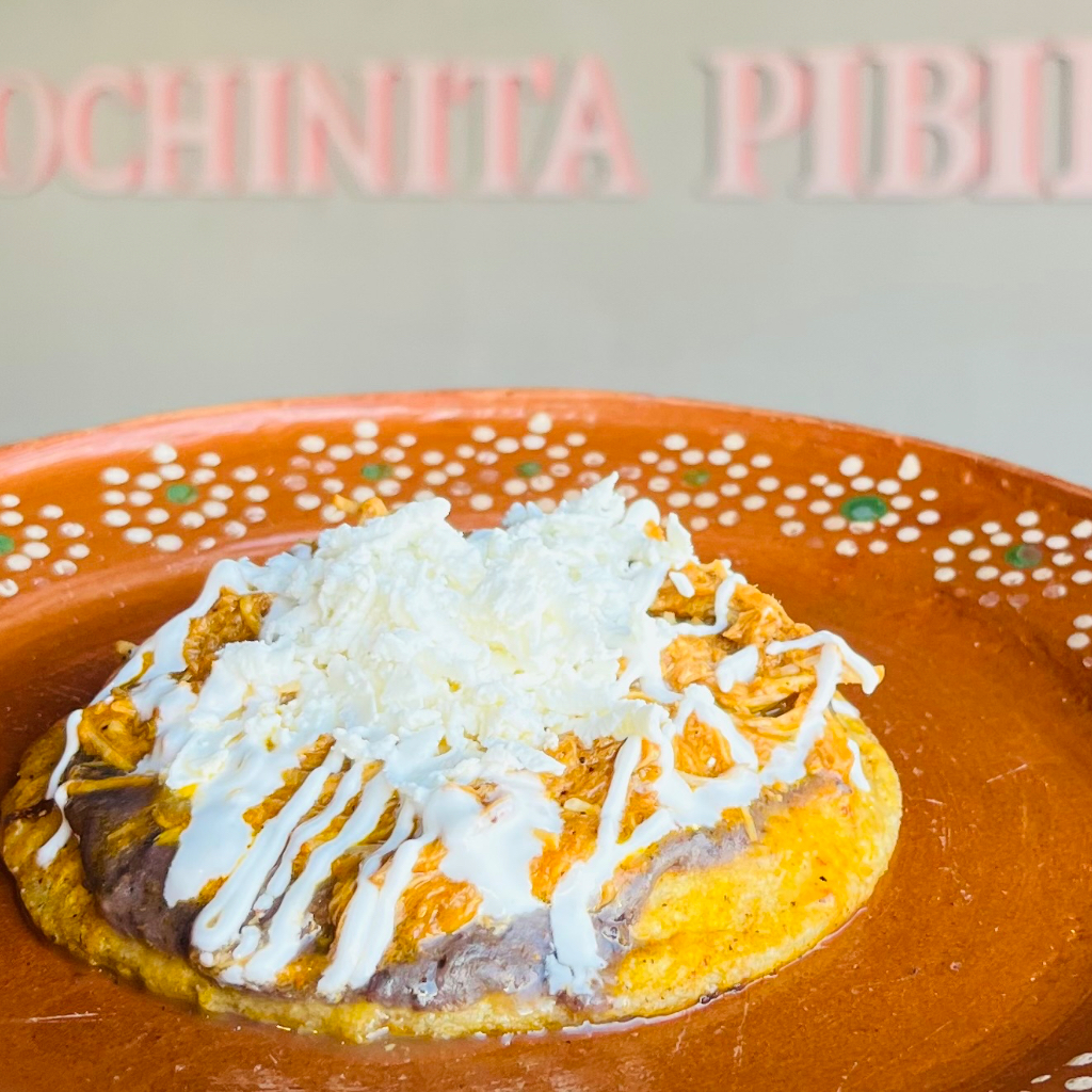 1 pieza de sope bañado en el jugo de la cochinita, con frijoles, cochinita pibil, queso fresco y crema