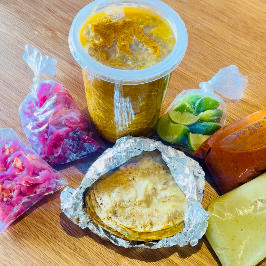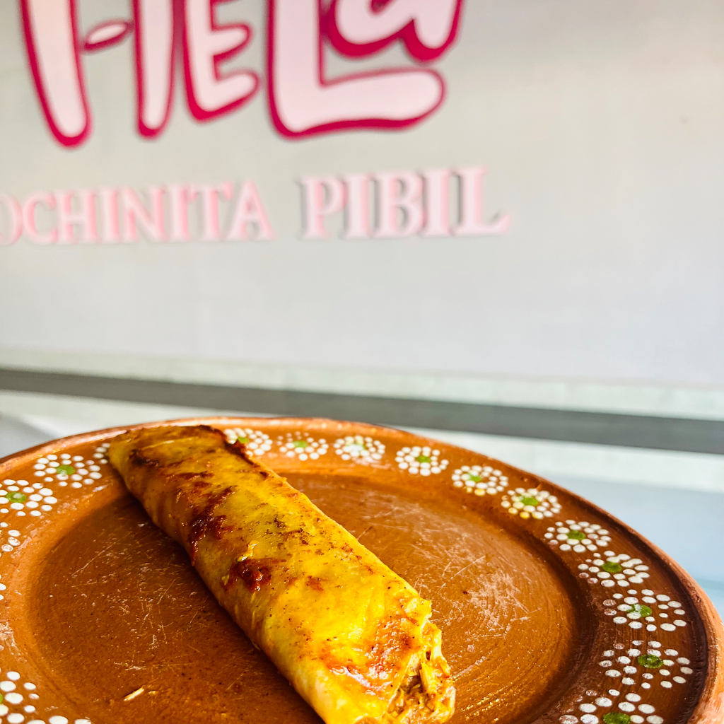 Paquete con un taco de tortilla de maíz con cochinita Pibil, 1 burrito, una costra de maíz y una chimichanga
