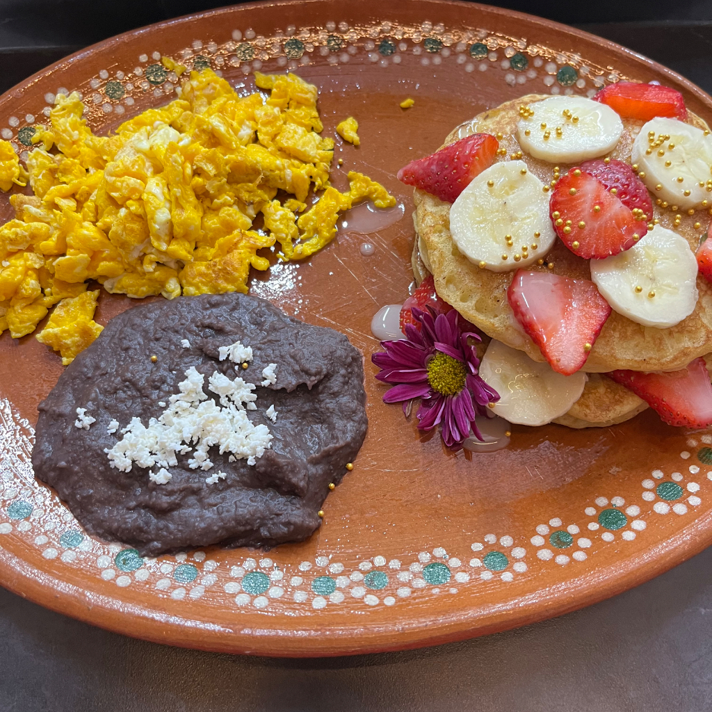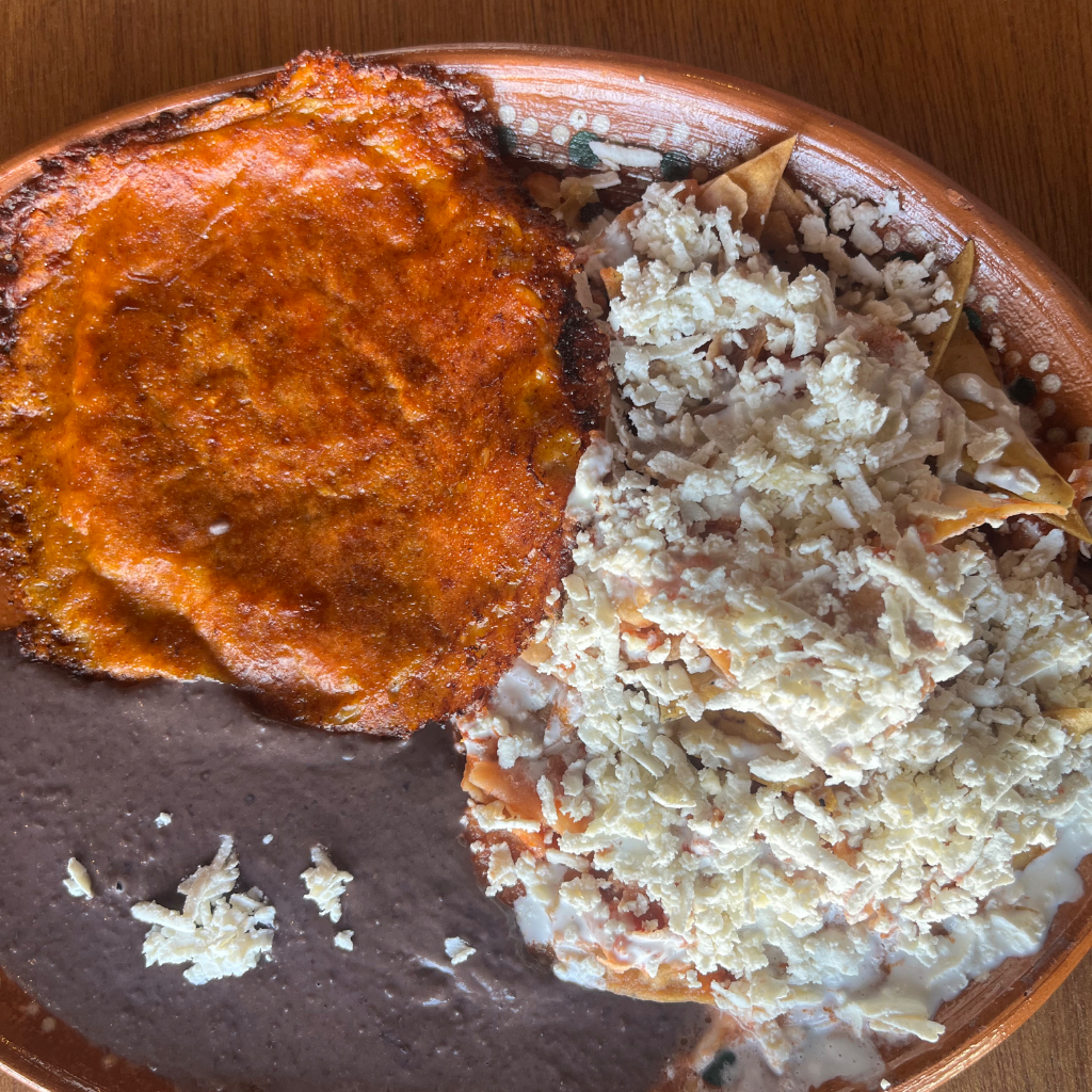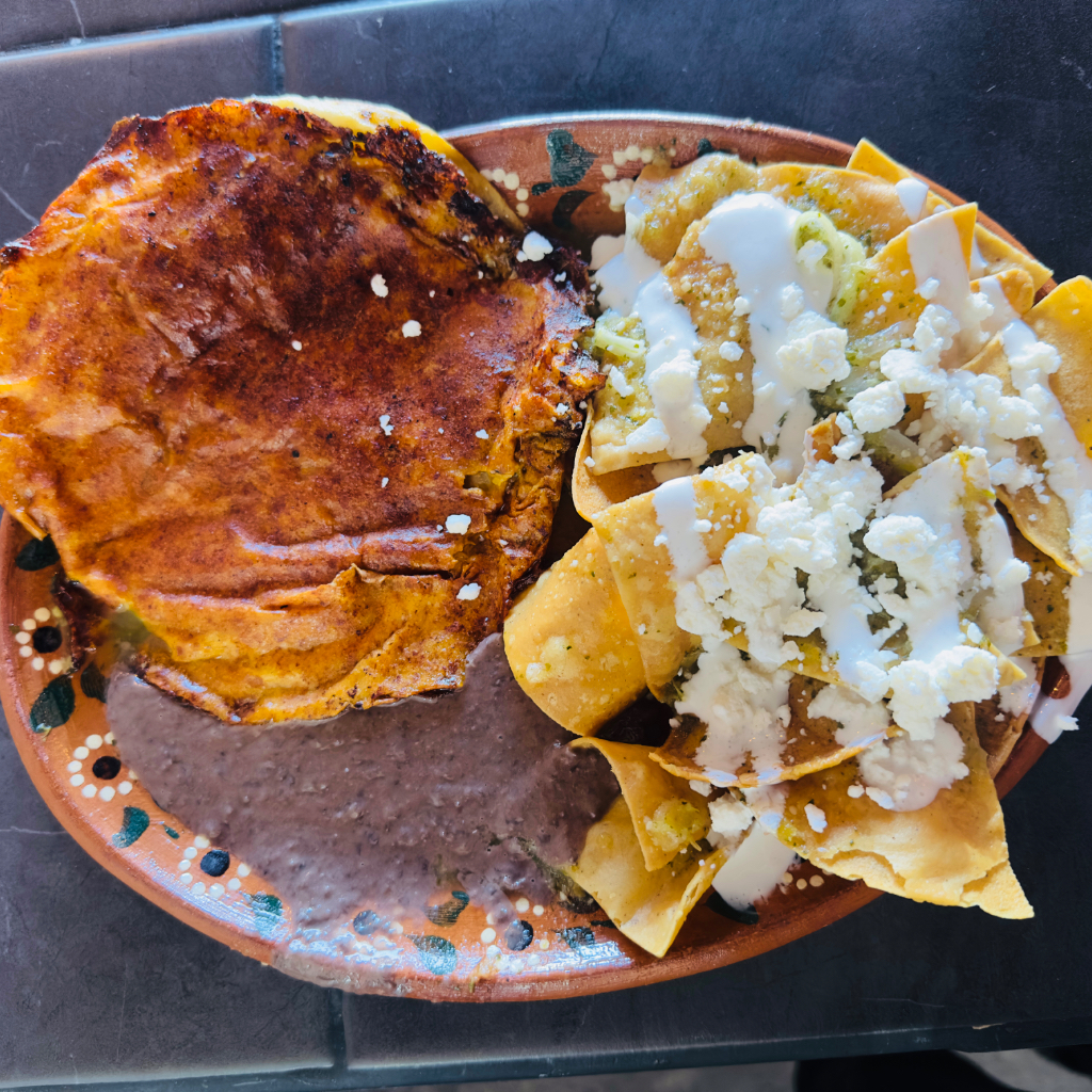 Costra de harina acompañada con chilaquiles con queso y crema y frijoles negros