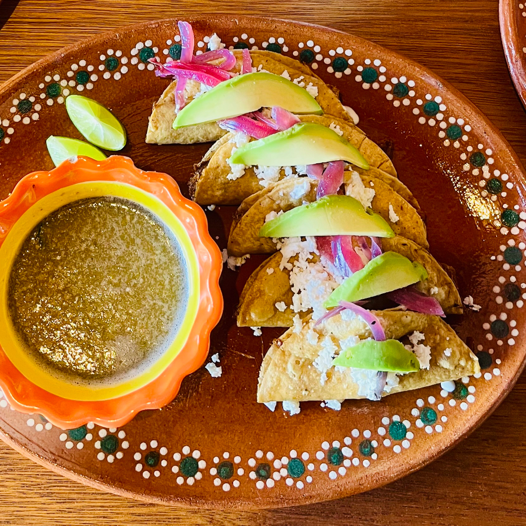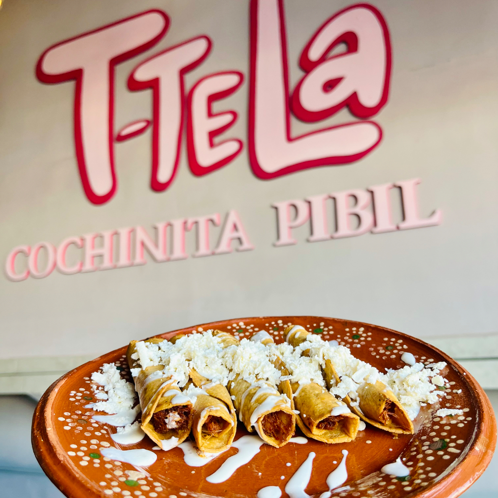 5 piezas de tortilla de maíz frita, rellenas de cochinita Pibil, con queso fresco y crema