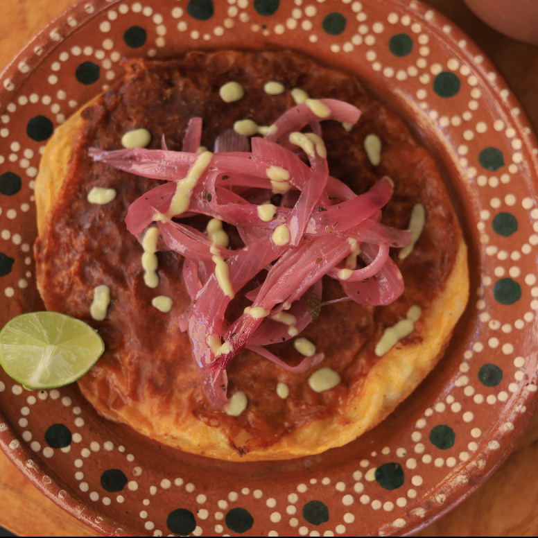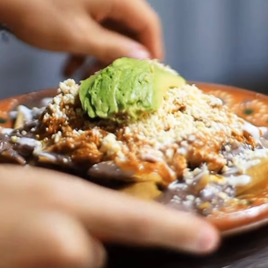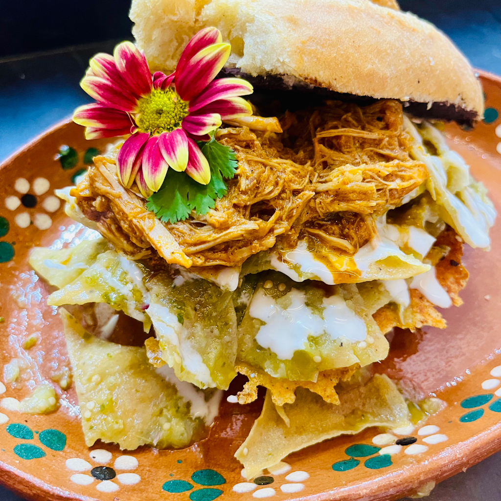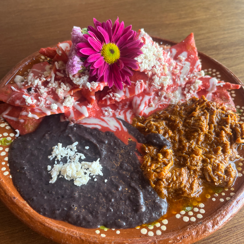 Totopos bañados en salsa verde, rosa o roja con crema y queso o aguacate, acompañados con Cochinita Pibil y frijoles negros