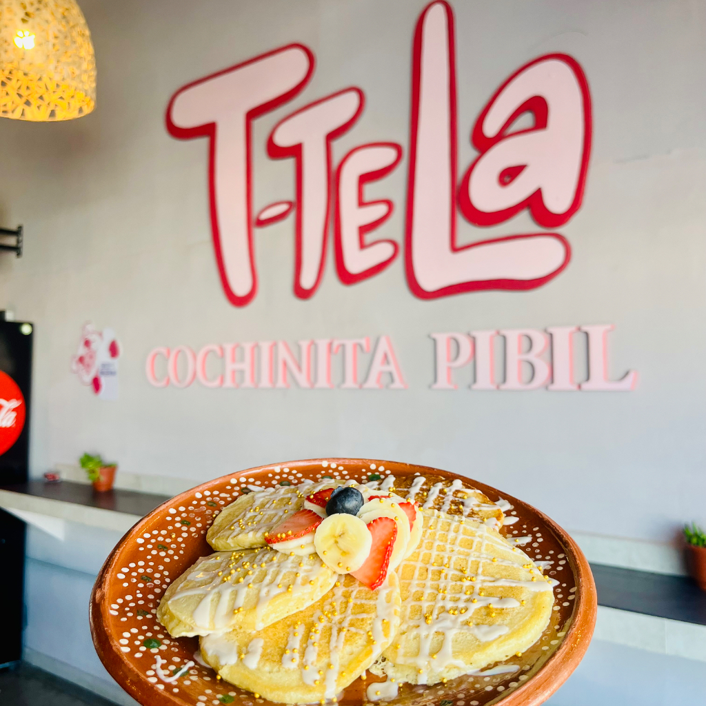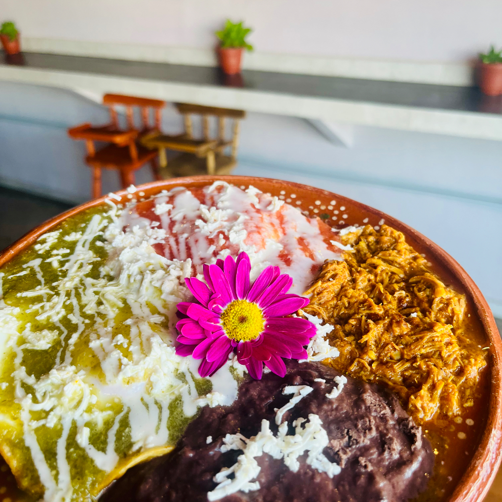 De Martes a Jueves, solo consumo en el local, Totopos bañados en salsa verde, rosa o roja con crema y queso o aguacate, acompañados con Cochinita Pibil y frijoles negros