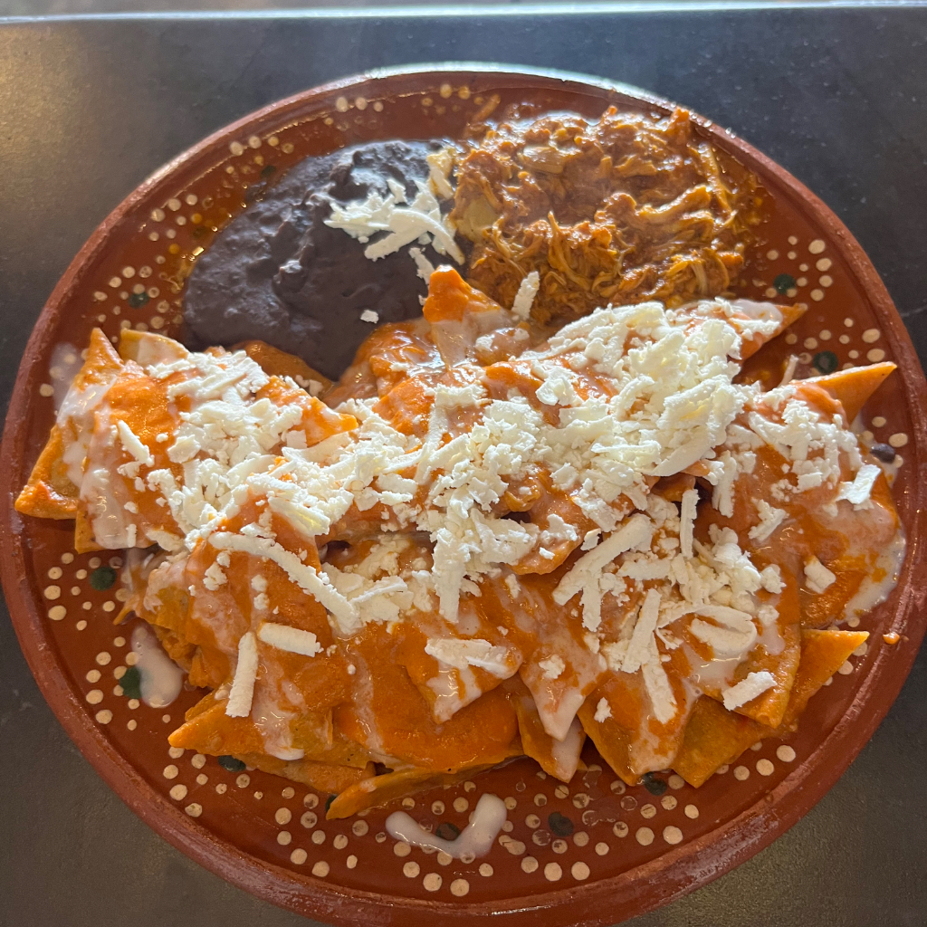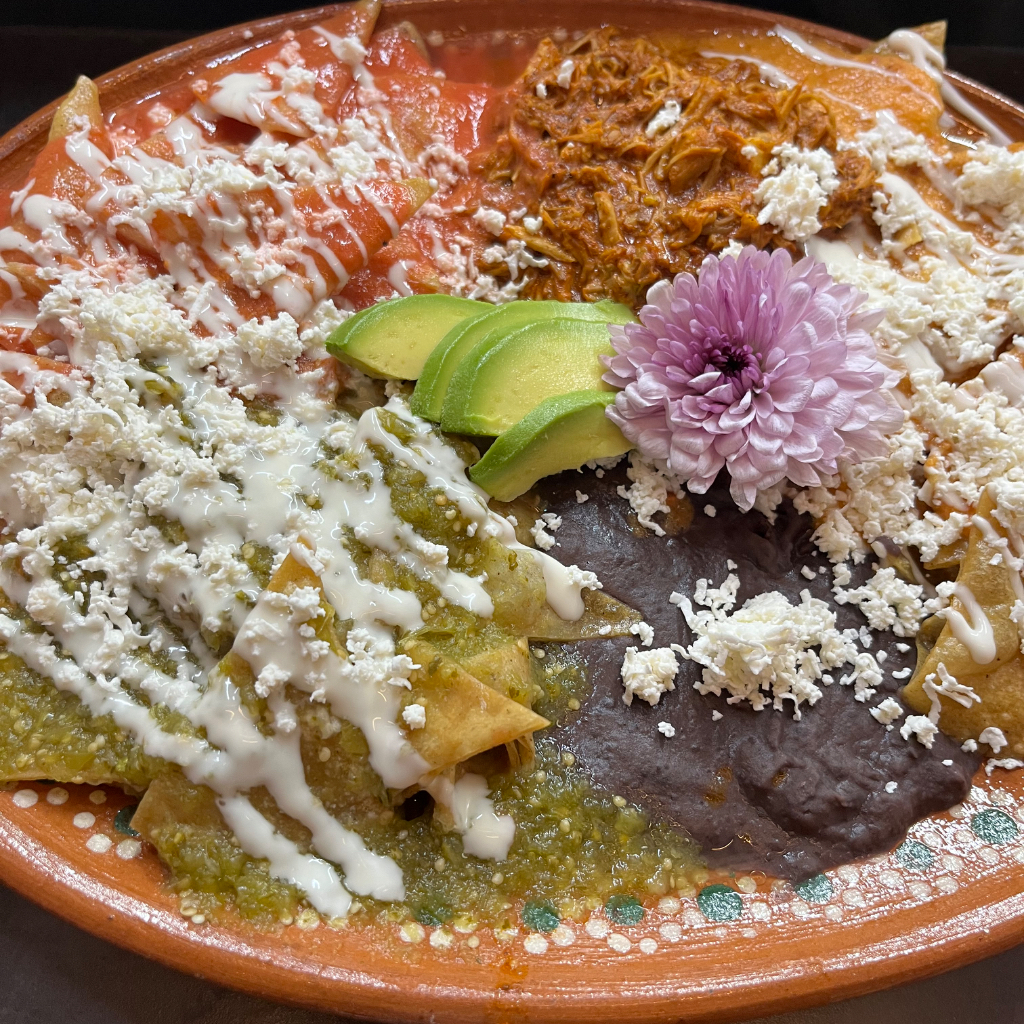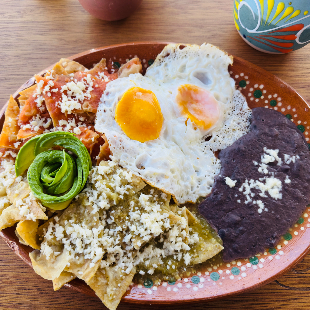 Totopos bañados mitad con salsa roja, mitad salsa verde, acompañados con huevo o cochinita pibil, frijoles negros, queso, crema y/o aguacate