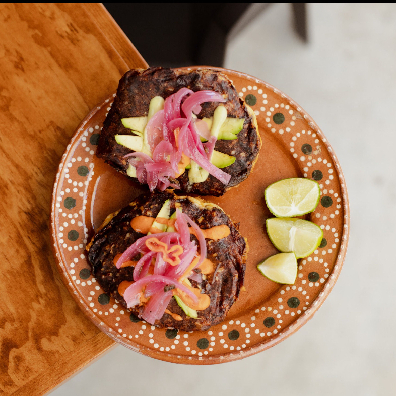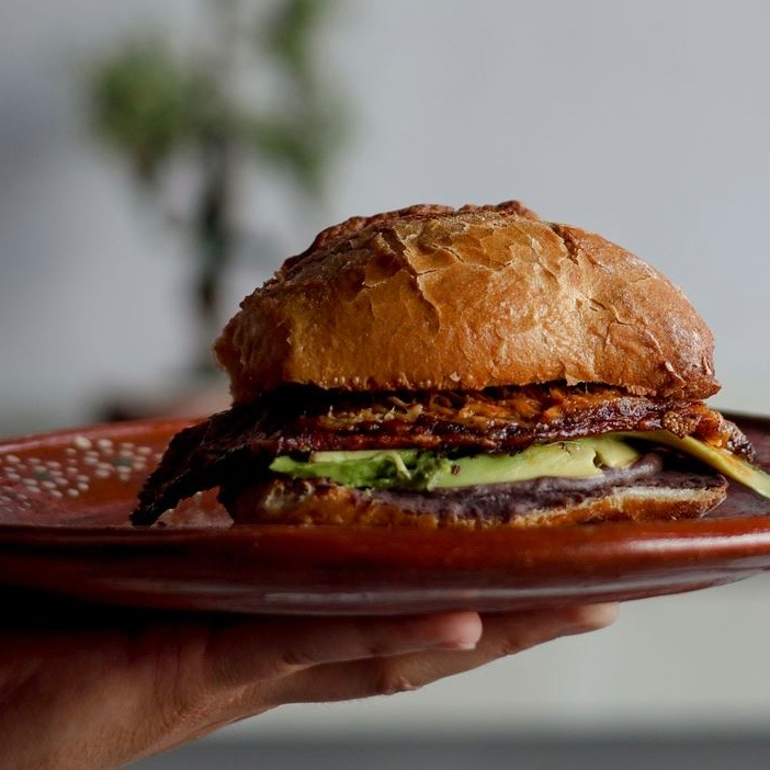 Bolillo crujiente relleno de Cochinita Pibil, queso Oaxaca a la plancha, frijoles negros y aguacate