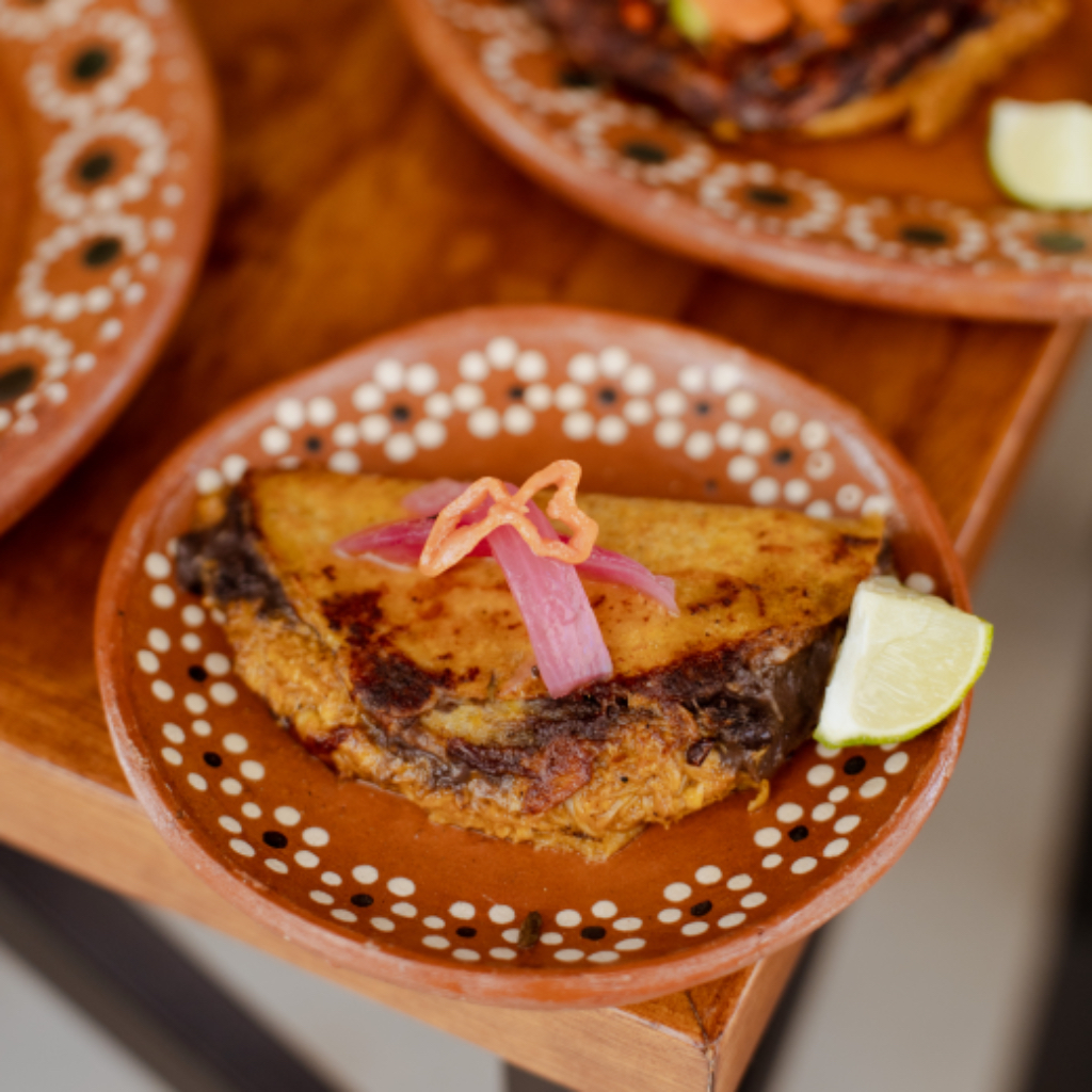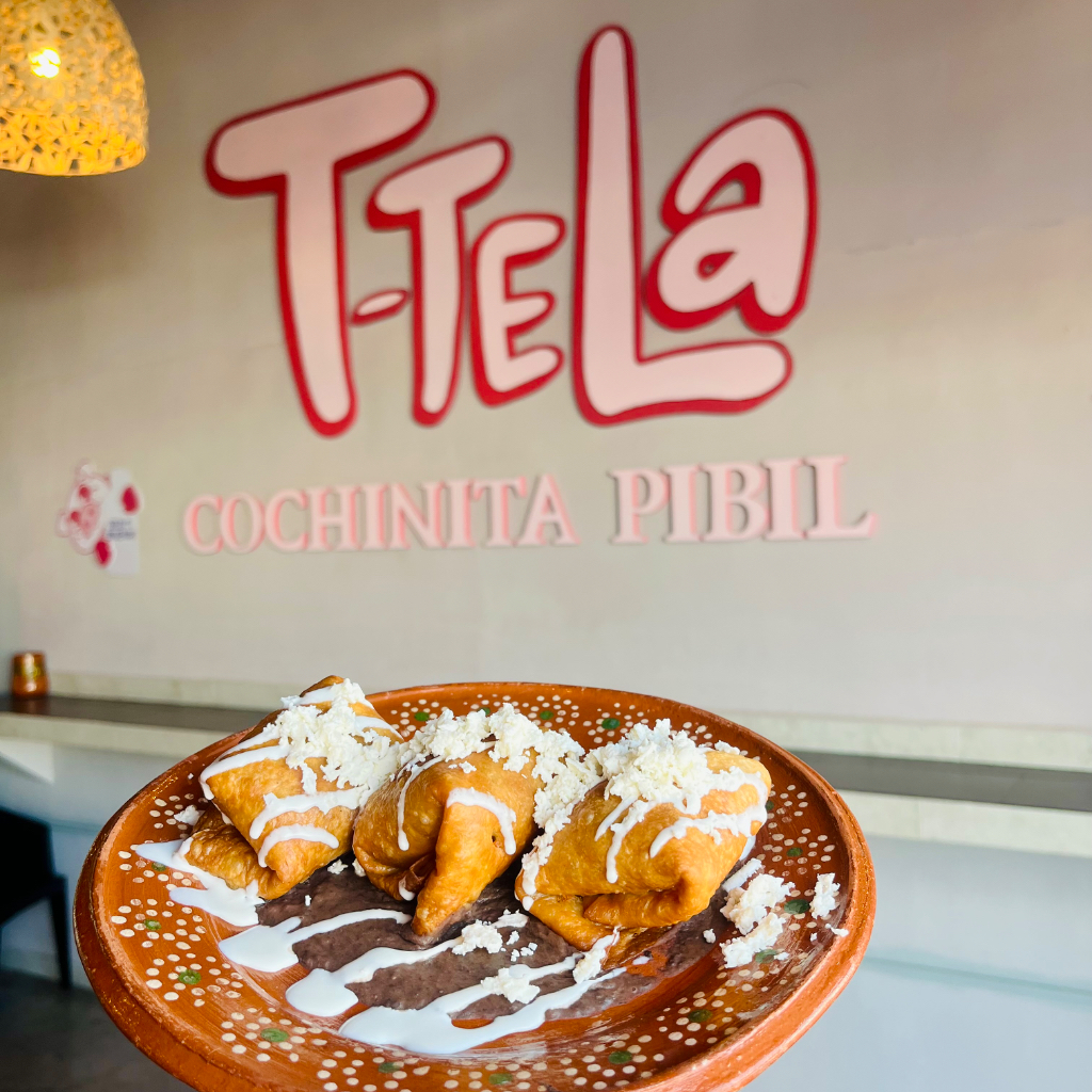 3 piezas de Tortilla de harina frita, rellena de cochinita pibil y queso oaxaca, montadas en una cama de frijoles negros, decoradas con queso y crema