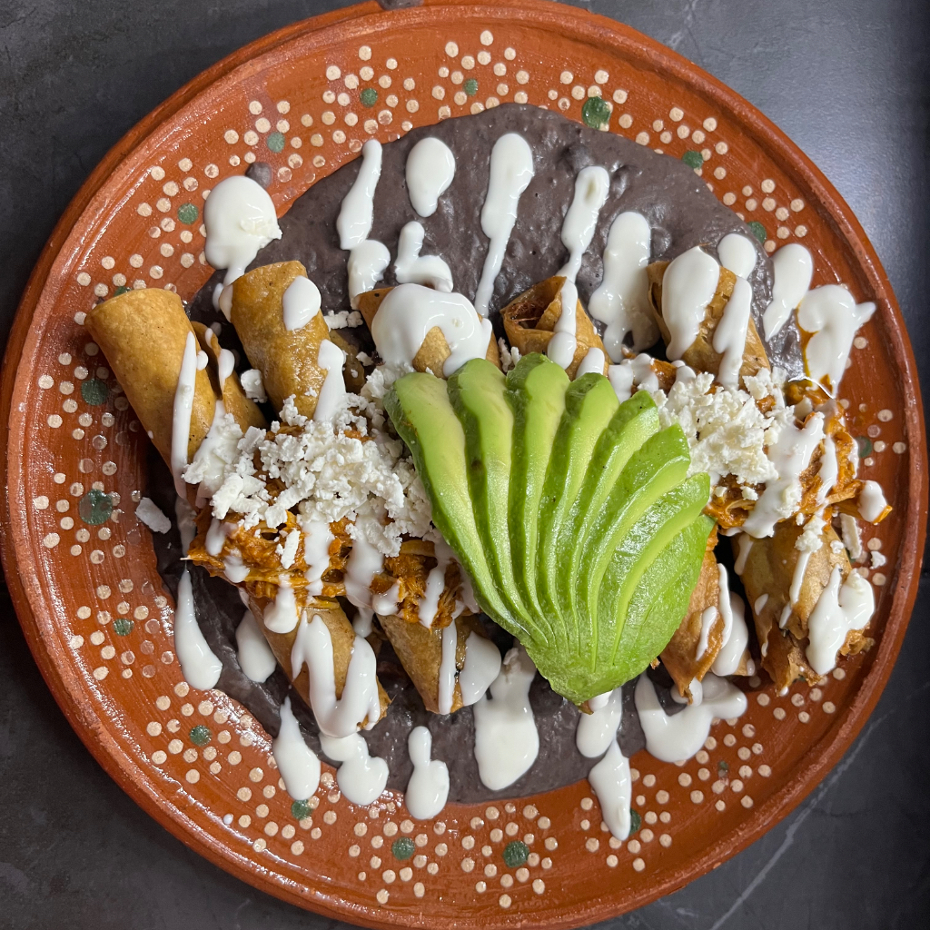 5 piezas de flautas de maíz doradas, con una cama de frijoles negros, encima cochinita pibil, queso, crema y aguacate