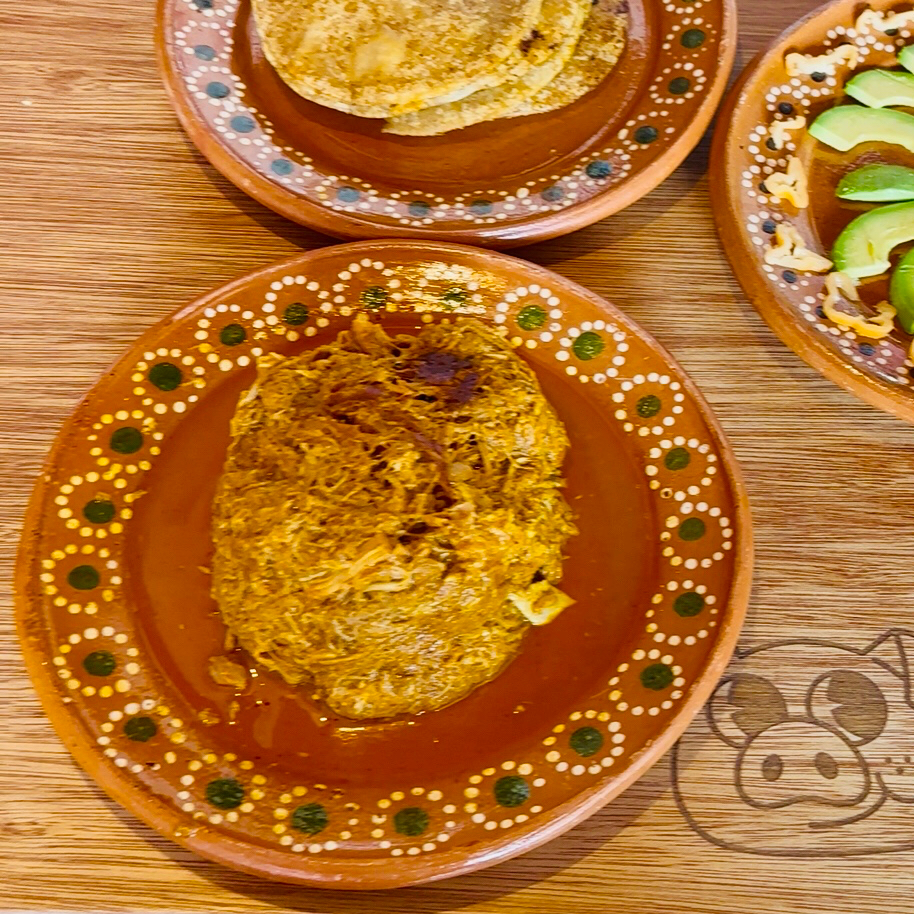 Torta rellena con chilaquiles (rojos o verdes) con crema, cochinita pibil, frijoles negros, y una costra de queso oaxaca