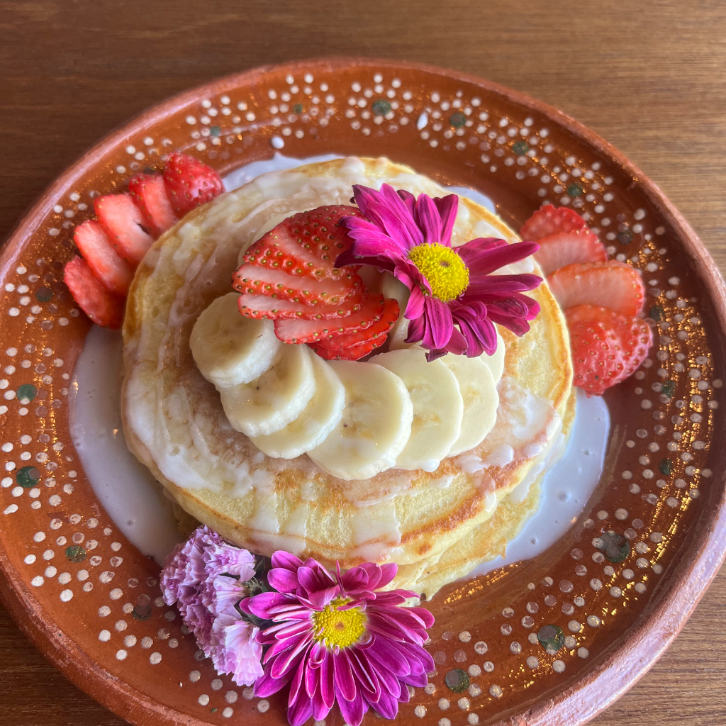 2 Hotcakes bañados con glaseado y acompañados con fruta (fresa y platano)
