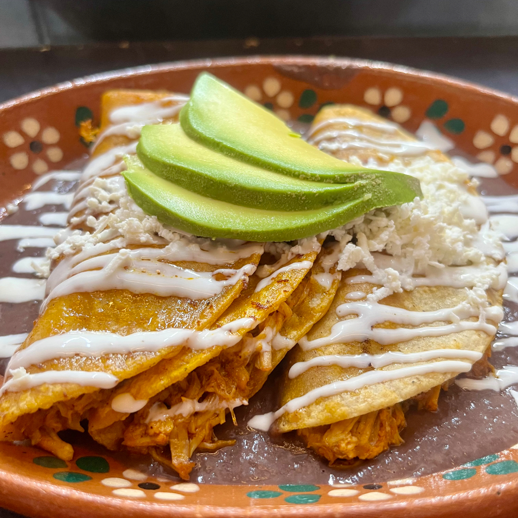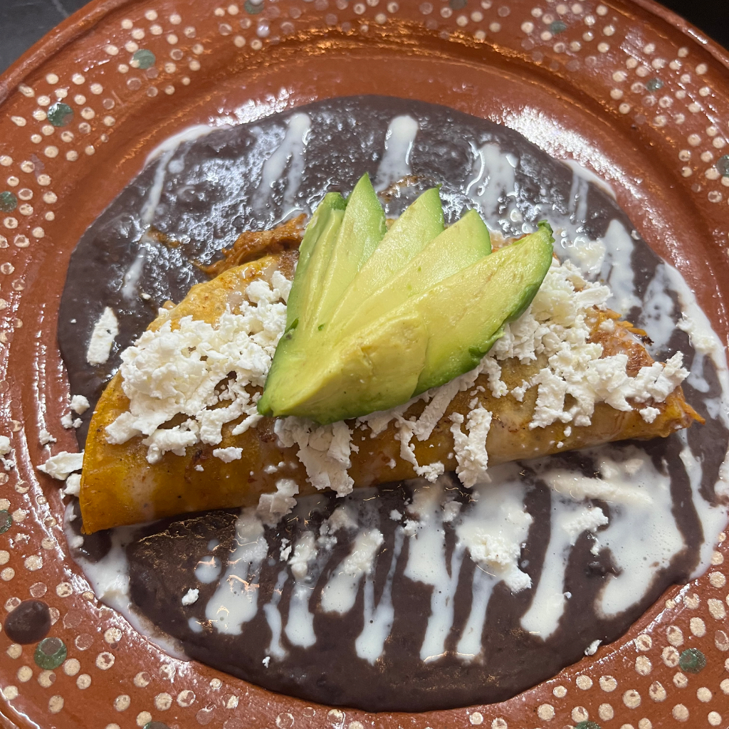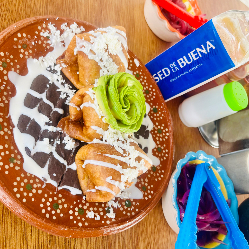 3 piezas de chimichangas (tortilla de harina rellena de cochinita y queso oaxaca fritas), en una cama de frijoles, decorado con queso fresco, crema y aguacate