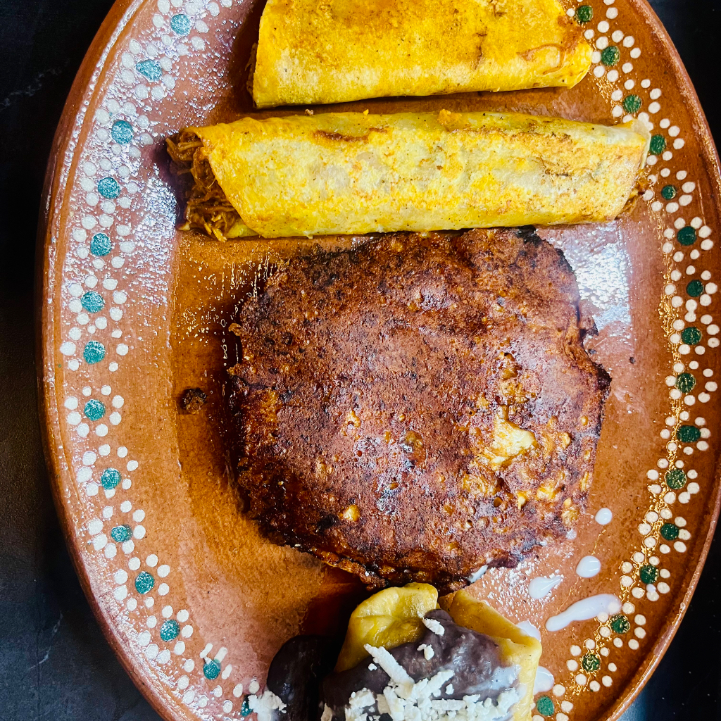 Costra de maíz acompañada con chilaquiles (rojos o verdes) con queso fresco y crema y frijoles negros