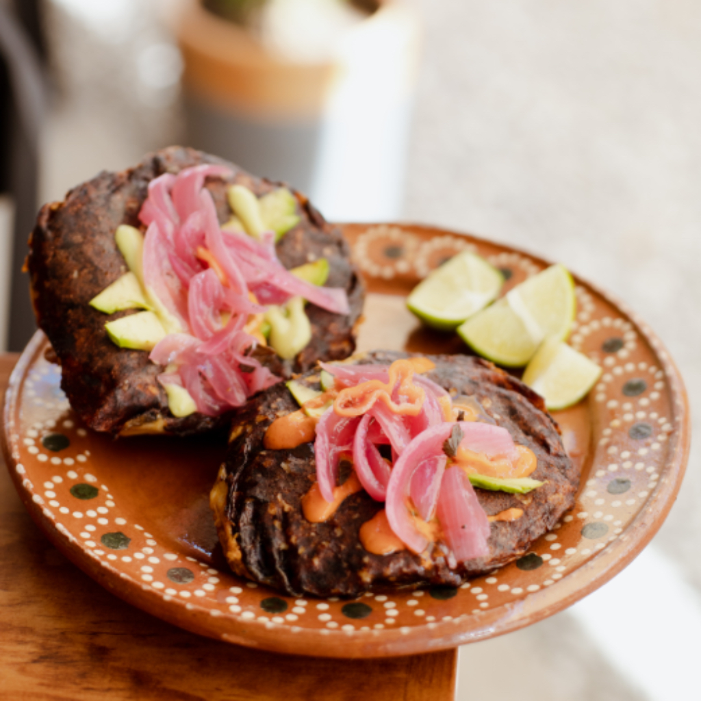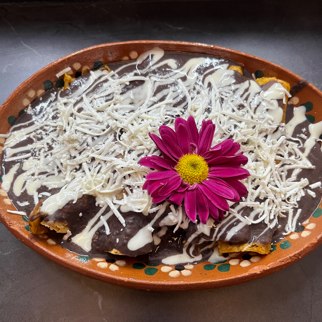 5 piezas de tortilla de maíz rellenas de cochinita o queso fresco, bañadas en frijoles negros, decoradas con queso fresco y crema