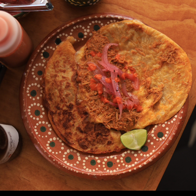 Tortilla de harina con queso y Cochinita Pibil, bañado en su jugo